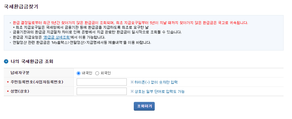 미수령 환급금 신청하지 않았을 경우 5년이 지나고 국고로 자동으로 귀속되기때문에 바로 조회하셔서 미수령 환급금이 있다면 바로 찾아가시길 바랍니다.