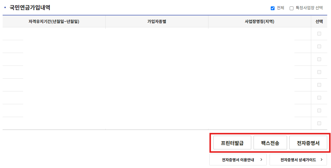 5. 가입증명서를 선택 (전체 또는 일부 선택 가능) - 프린트발급,팩스전송,전자증명서 중 원하는 형태로 선택