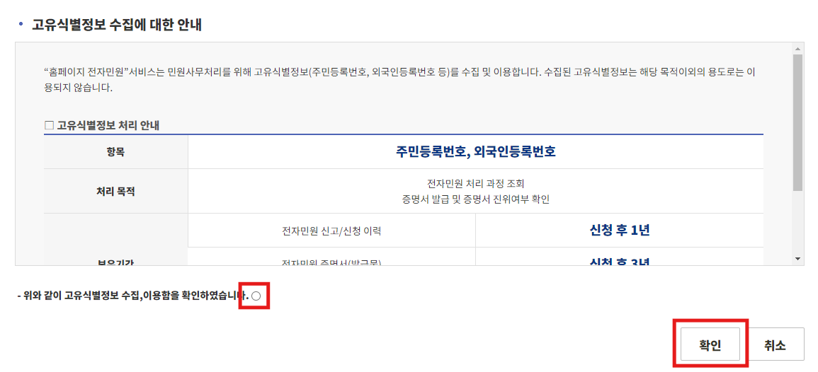 6. 발급용도 선택 후 확인 클릭