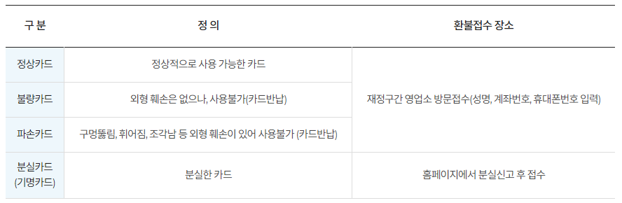 - 불량카드는 최초 구입(발급) 후 1년 이내에 한해 카드구매금액(5,000원) 계좌 환불