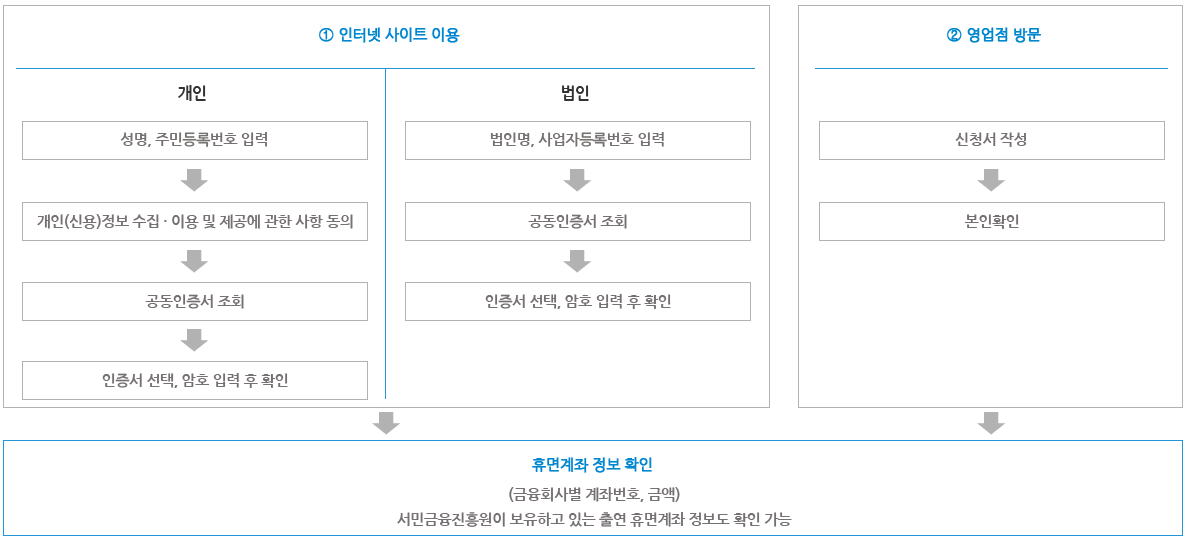 • 서민금융진흥원에 출연된 휴면계좌가 존재할 경우 해당 금융회사를 방문해 지급을 요청하면 서민금융진흥원에서 처리 함